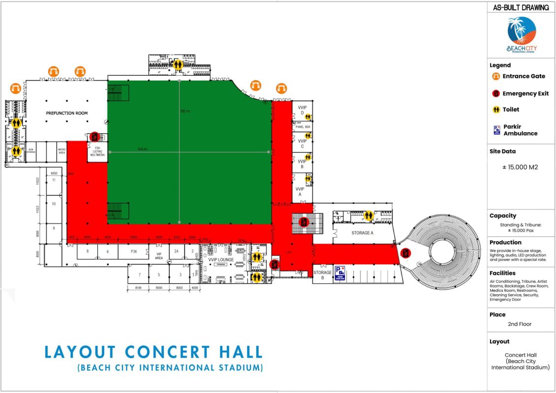 Air Conditioning, Tribune, Artist Rooms, Backstage, Crew Room, Medics Room, Restrooms, Cleaning Service, Security, Emergency Door.